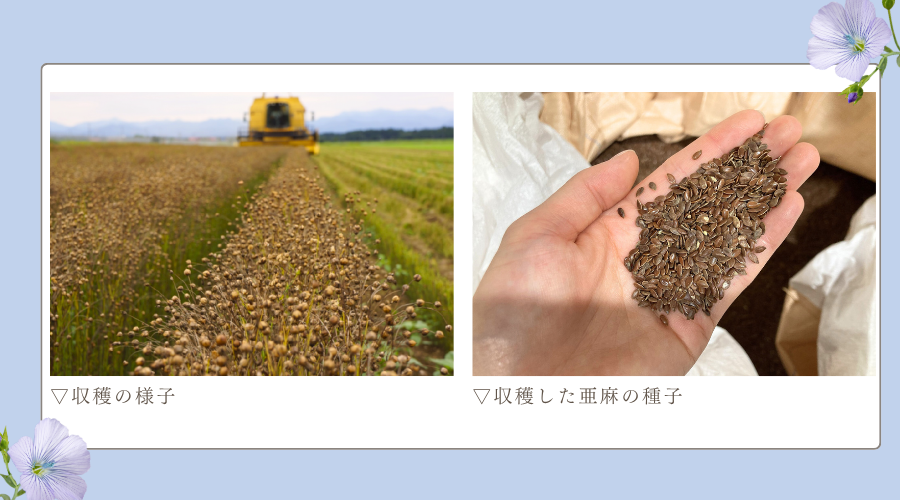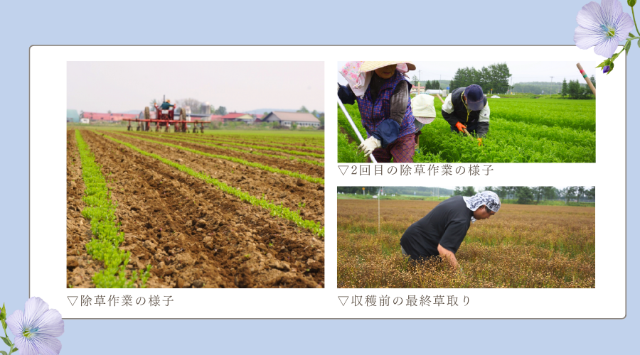 身体や健康を想い亜麻仁オイルを食べる人のことを想い、私たちも極力農薬を使わずに機械や人間の手を使って、健全で安心な高品質の亜麻を作っています。