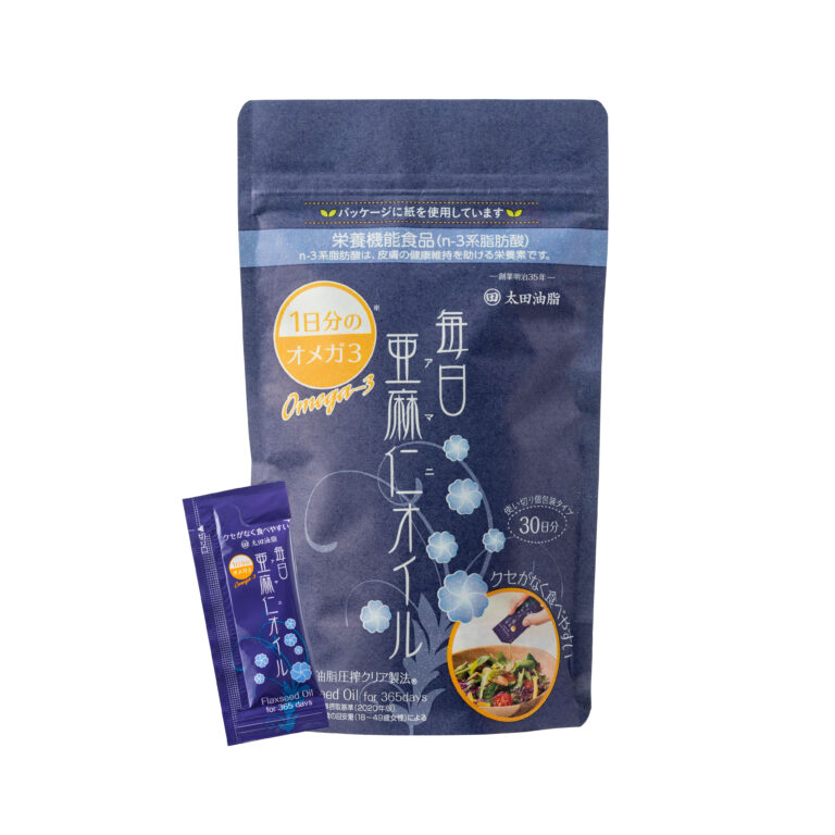 また、1日の小さじ1杯を小袋入りにした商品「毎日えごまオイル」「毎日亜麻仁オイル」もございます。こちらは1日1袋が目安となっているため、計量の手間がなく、毎日手軽に続けたい方にお勧めです。