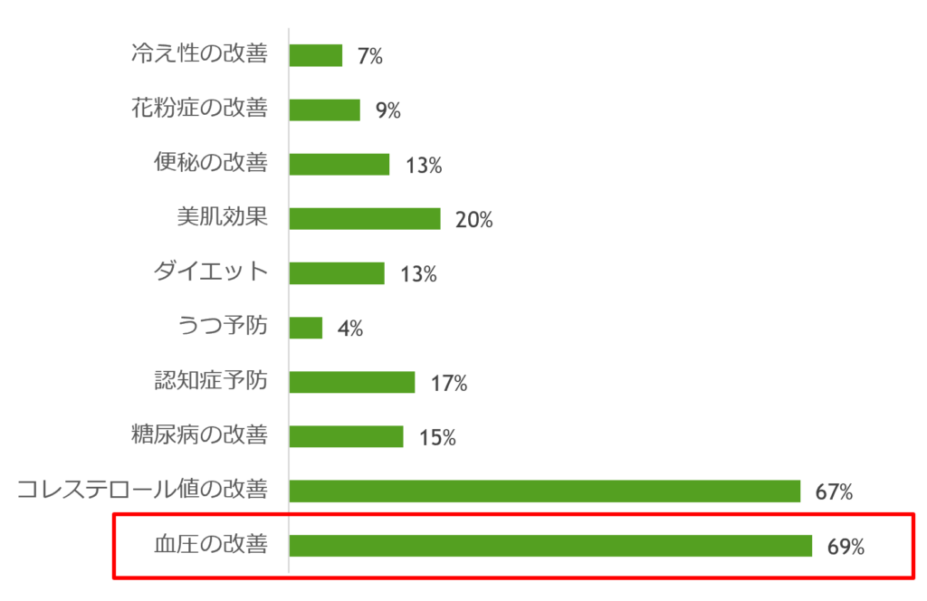 えごま油に期待される効果について、「血圧の改善」を期待する声が最も多い結果が出ております。(中部電力ミライズ㈱「みんなの得トクひろば」アンケートより)