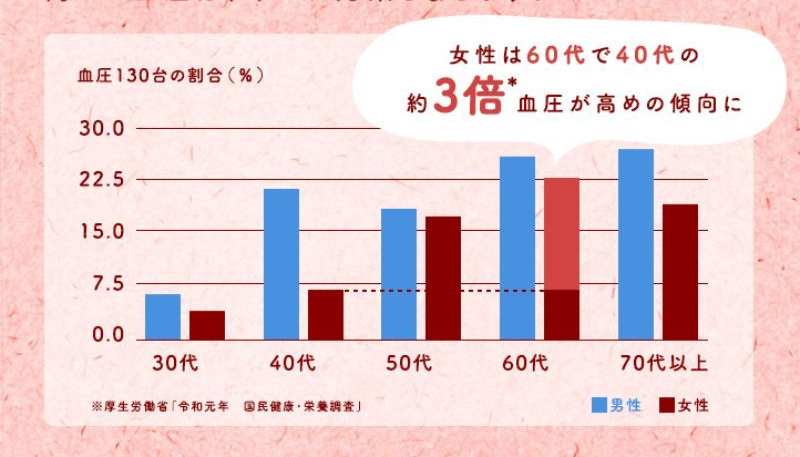 女性は60代で40代の約3倍(※)、血圧が高めの傾向にあります。